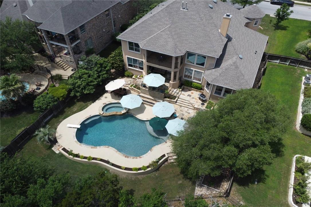 This stellar 4 bedroom, 4.5 bathroom, 3 car garage, two-story stone and stucco residence rests in the tranquil hill country of the lavish Master-Planned Steiner Ranch neighborhood, within walking distance of the largest community center Steiner Ranch offers - the Bella Mar. Upon entry, you are greeted with a floor-to-ceiling foyer and an elaborate wine closet! The chef's kitchen, complete with a 6-burner gas stove, 3 ovens, one of which is a built-in convection oven/ microwave combo, a prep island, a butler's pantry, and a large countertop bar, will have you dreaming up new recipes! The "sunroom", an extra living space adjacent to the kitchen, is perfectly designed to evolve with your family: from a kid's play area that can be observed from the kitchen, to a study/reading/computer room. The main living area presents an atrium-style open ceiling to the upstairs loft area for a wide-open feel and lets all the sunlight in from the wall of windows from the back of the house. The Great Room features a stunning one-and-a-half-story wood-burning limestone fireplace, perfect for family gatherings and entertaining! The upstairs holds 3 bedrooms, each with its own adjacent bathroom, a secondary loft living space, and an incredible media or bonus room, perfect for an in-home escape, as it is plumbed for a wet bar, and is fully wired for surround sound! The backyard is the cherry on top - a gorgeous, resort-style paradise! The pool comes complete with a large beach entry, shallow and deep ends, a diving board, and an oversized hot tub. The pool deck features a large stone gas fire pit and sitting area, canopied by a shaded pergola with an overhead fan, lighting, and an outdoor fridge. This is a space for all ages to enjoy! This home is fitted with 2 HVAC units to provide 3 zoned areas to keep the perfect temperature year-round, and a home security system to add to your peace of mind. Come see this piece of paradise for purchase!